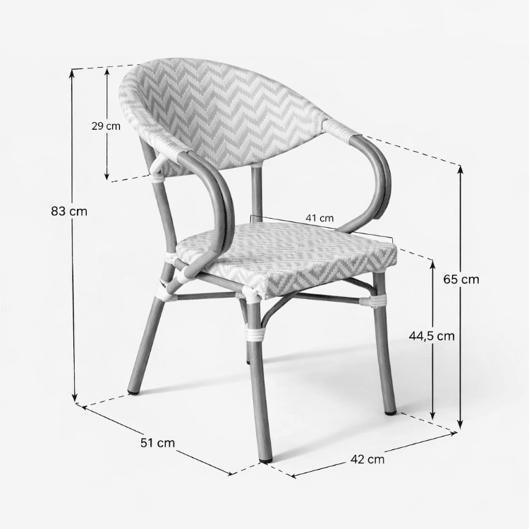 Su estructura de aluminio ligero y resistente garantiza una excelente durabilidad frente a la intemperie y al uso diario, convirtiéndola en una opción ideal como silla de terraza para hostelería profesional. Además, su ligereza facilita su manipulación y reorganización en terrazas y espacios exteriores.