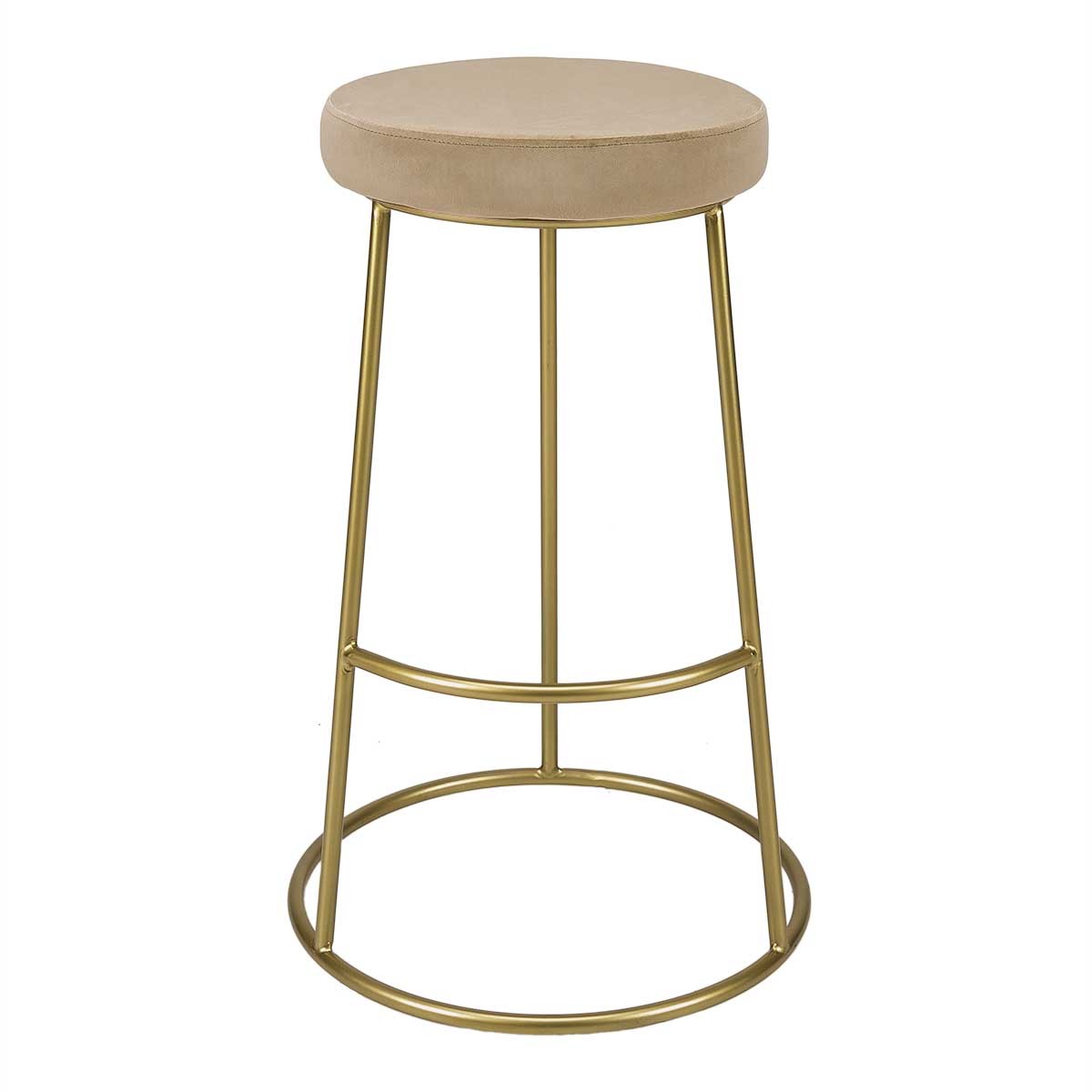 Taburete de diseño tapizado en tela de terciopelo color beige, estructura de acero terminación en dorado, con reposapies en su parte delantera.