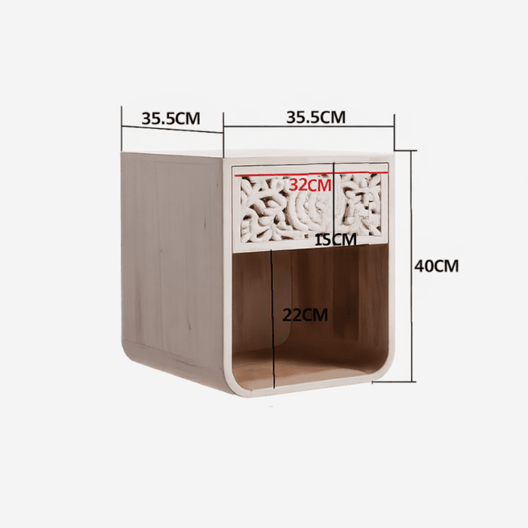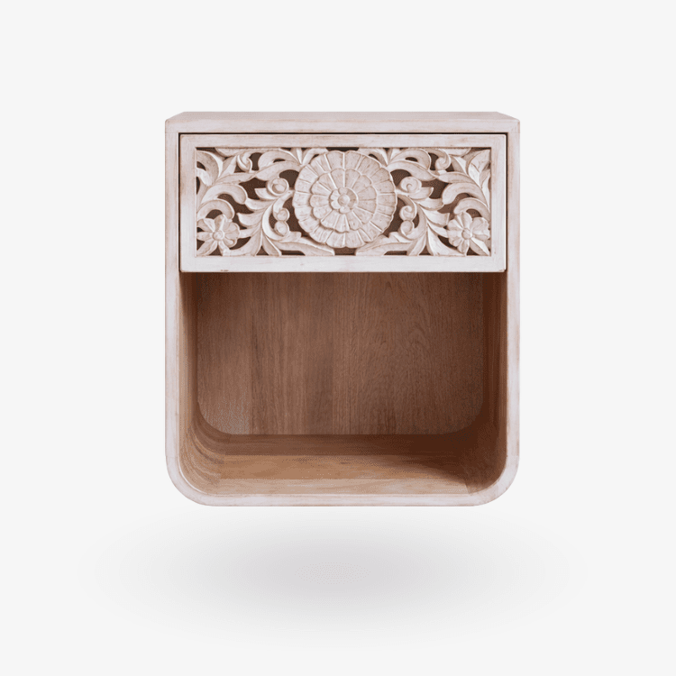 La mesilla Nall es una pieza de carácter artesanal que aporta textura, calidez y personalidad al dormitorio. Fabricada en madera maciza y tallada a mano en la India, destaca por su frontal decorado con motivos florales que realzan el trabajo manual y convierten cada unidad en una pieza única.
